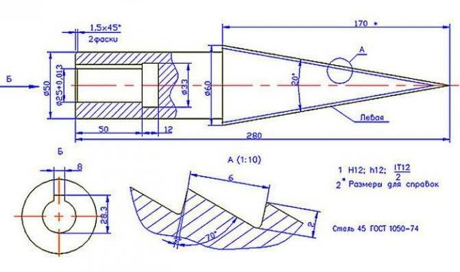 Перед сборкой конструкции необходимо подловить составные части. Раскалывающая часть должна быть выточена по чертежу конусного дровокола. Если использовать инструмент без резьбы, придется прикладывать достаточное усилие при расколе дров. Резьбовой наконечник вгрызается в древесину, тем самым делает процесс более облегченным. Изготовление наконечника производится на токарном станке с определенными параметрами. Обычно такие работы заказывают в токарном цеху, но если есть опыт работы и оборудование, возможно изготовить приспособление для конусного дровокола своими руками.