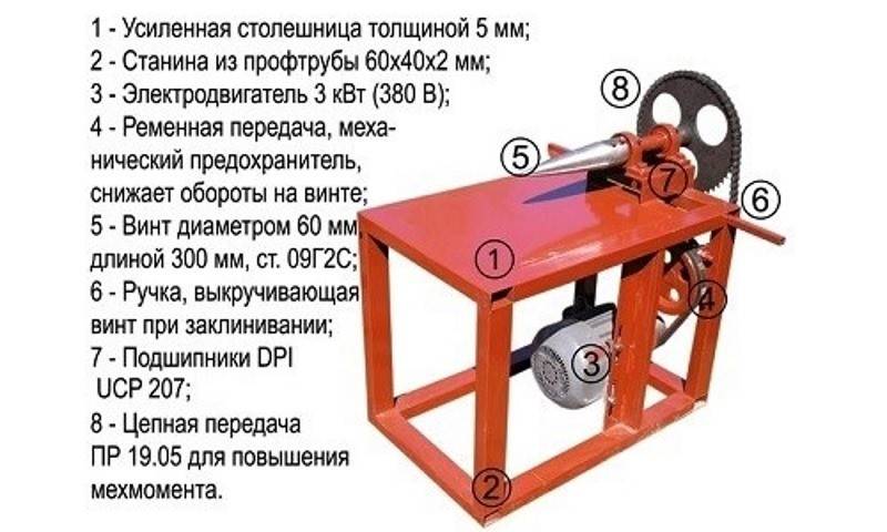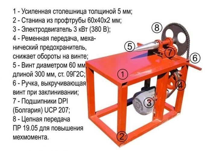 Из перечисленных инструментов для колки дров легче всего смонтировать дровокол винтового типа. Не стоит бояться сборки, ведь она происходит поэтапно, а сам процесс несложен. По конструкции такой прибор довольно прост, что можно увидеть на схеме ниже.