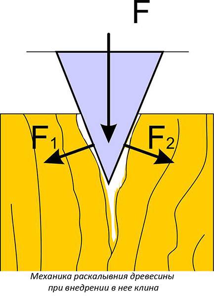 Принцип действия основан на раскалывании полена конусным винтом с крупной упорной резьбой. Данный винт ввинчиваясь в дерево раскалывает его.