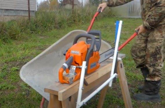 Для этого бензопилу в обычной комплектации устанавливают на подготовленной деревянной станине.