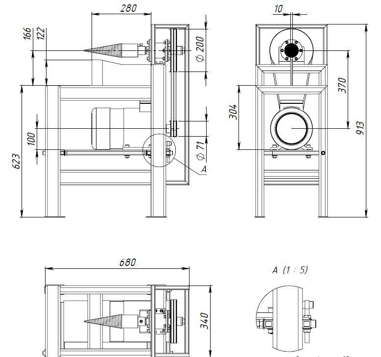 Бытовой конусный дровокол производители изготавливают как в стационарном, так и в мобильном исполнении. В последнем случае каркас снабжается осью с двумя колесами, благодаря которым станок можно свободно перемещать к месту колки дров.