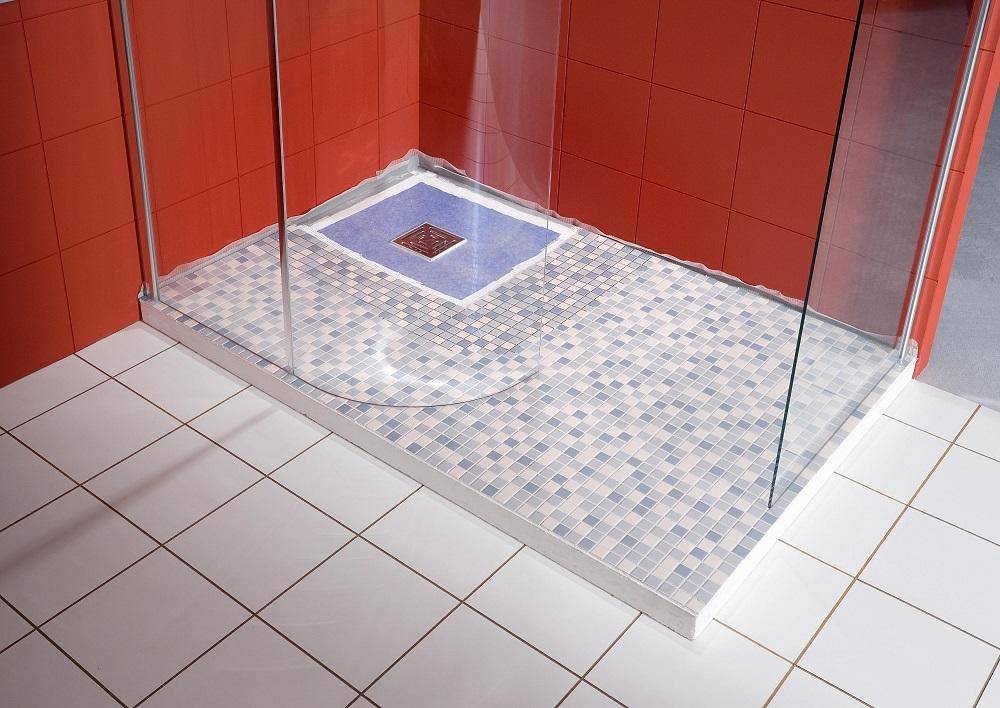 Для наиболее правильного устройства душевых помещений такого типа большое значение имеет горизонт поверхности пола, а также его гидроизоляция. Поэтому первым шагом будет выполнение стяжки на полу по маякам, если уровень не соблюден. Тщательная гидроизоляция стыков между полом и стенами поможет избежать возможных неприятностей в случае протечки по системе слива. Наиболее правильным решением будет использовать двухкомпонентную гидроизоляцию, нанесенную на стены и пол ванной комнаты в два слоя с выходом за габариты конечного изделия около 15 см.