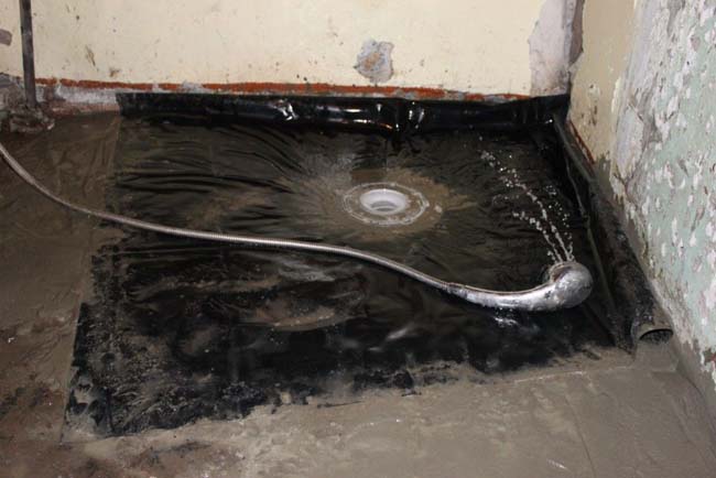 При изготовлении слива с поддоном в многоквартирном доме следует подумать о надежной гидроизоляции чернового пола в месте, где намечается строительство душевой кабины.
