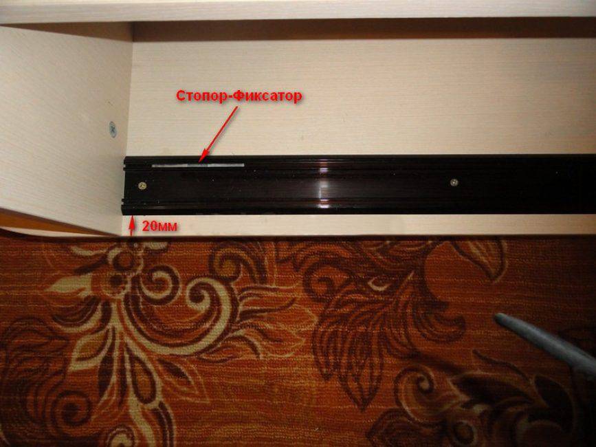 Сначала прикручивают верхнюю направляющую. Она крепится или к потолку, или к верхней части шкафа. Расстояние от полок — не менее 100 мм, иначе двери будут задевать полки, вещи, плечики.