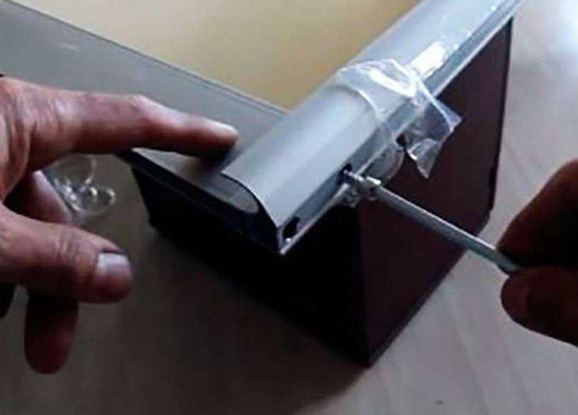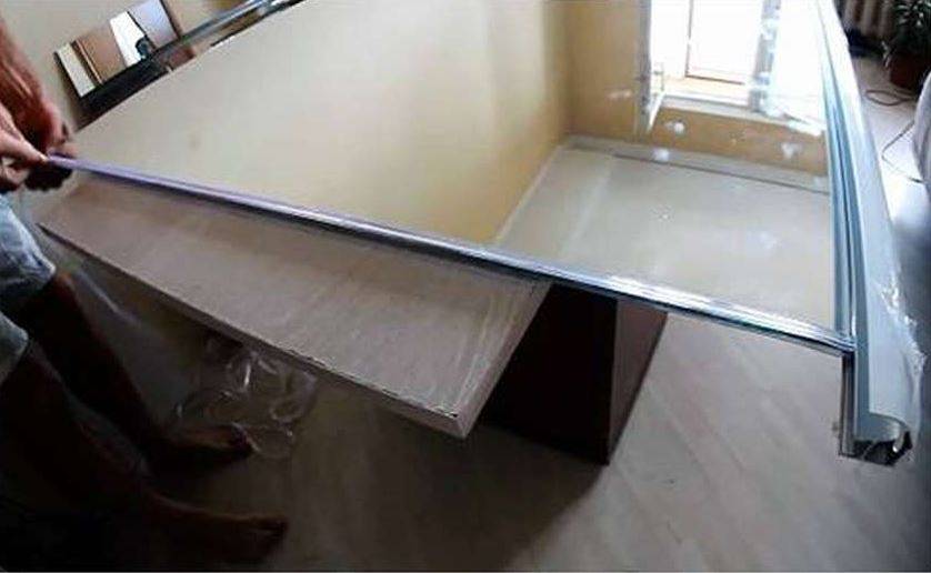 При сборке в первую очередь собираются все части наполнения. Сначала, если есть стекло или зеркало, по периметру устанавливается уплотнительная резина. Она просто нажатием пальца надевается на торец детали. По краям уплотнитель срезают, надевают впритык, но без нахлеста на следующую сторону.