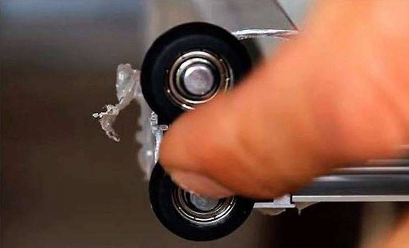 Если нажать на колесо ролика, он уйдет в корпус, затем возвратиться за счет упругости пружины. Этот нехитрый механизм обеспечивает плавность хода двери для шкафа купе.