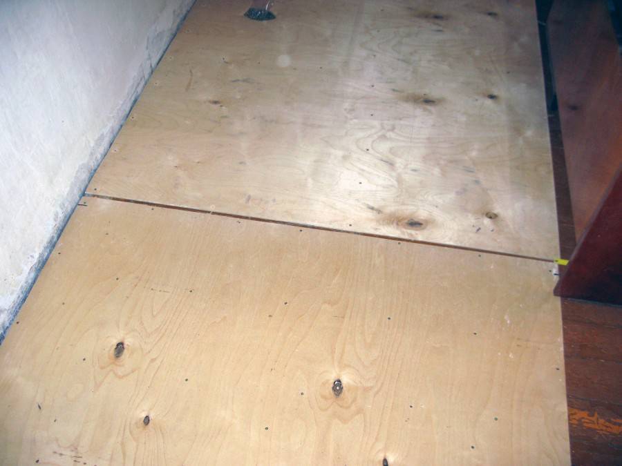 При настиле материала из древесного композита на деревянный пол из-за выпирающих досок также может образоваться сквозное отверстие. Если дефект слишком обширный и не поддаётся ремонту, лучше всего полностью заменить плиту, при этом устранив неровности на полу с помощью рубанка. При небольших повреждениях потребуется аккуратно обрезать отверстие монтажным ножом под размер вставляемой части материала. В получившееся гнездо устанавливается заплатка из древесного композита. Закреплять лучше всего клеем или саморезами.