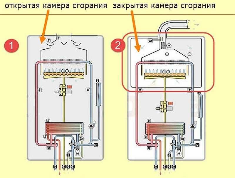 - Камеры сгорания, открытого или закрытого типа. При использовании закрытой камеры над ней располагается вентилятор, обеспечивающий подачу воздуха в зону горения и удаление продуктов сгорания.