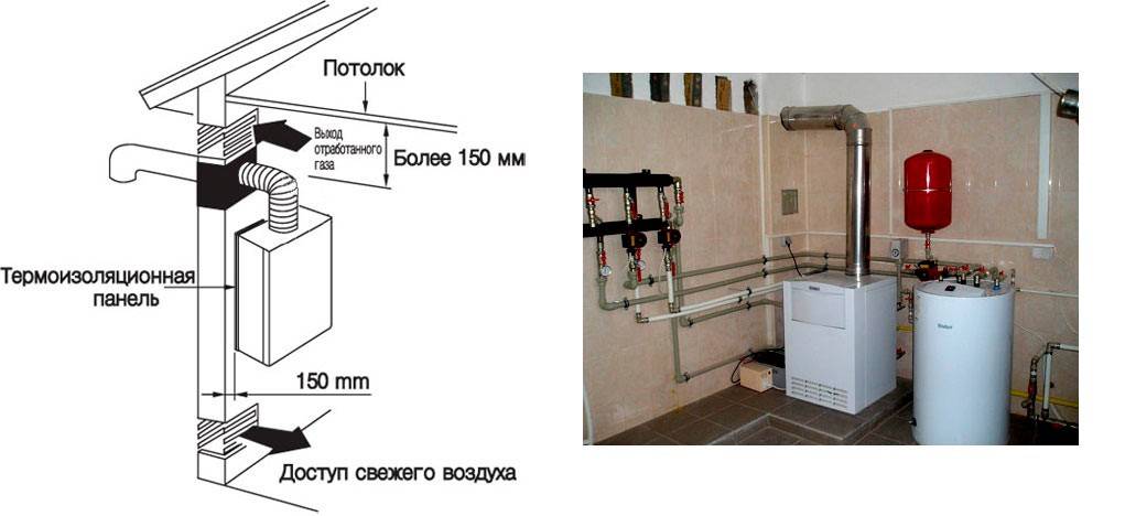 Когда дымоход для турбированного газового котла монтируется вертикально и пересекает строительные конструкции, к нему выдвигаются те же требования. Это делается для пожарной безопасности, чтобы исключить возгорание материалов перекрытий и распространения пожара с одного этажа на другой. С той же целью вблизи горячего газохода, проходящего по котельной, запрещено размещать предметы и изделия из легковоспламеняющихся материалов.