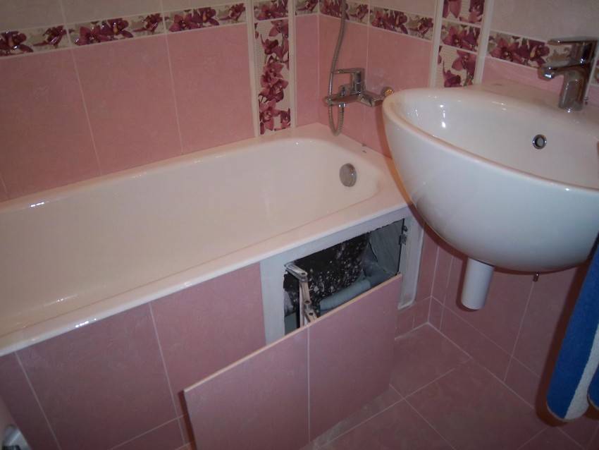 В этом варианте все просто. По границе ванны или же от стенки до стенки, возле которой стоит ванна, возводится кирпичная стенка толщиной в полкирпича. Обязательно, как и при возведении обычной стены, кирпич перешивается, то есть каждый следующий ряд смещается на полкирпича. В месте удобном для доступа к сливу ванны формируется окошко. Для того чтобы его прикрыть, достаточно купить или изготовить дверцу и прикрепить на навесы.