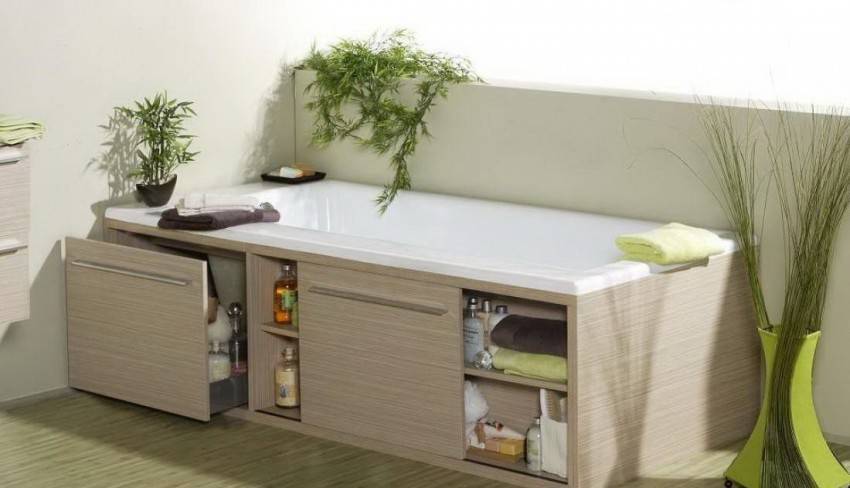 Плюс еще и в том, что мы можем расширить функциональность своего экрана и превратить его в удобное место для размещения самых нужных нам предметов. Под ванной можно разместить всевозможные шкафчики и полочки, куда поместятся моющие средства или другие необходимые в хозяйстве предметы. Поэтому прежде чем приступить к изготовлению конструкции, нужно определиться, для реализации каких функций будет предназначен ваш экран.