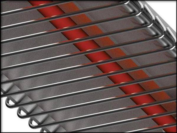 Нам более известны трубчатые нагревательные элементы. Трубка из высокопрочной стали наполняется мелкозернистым кварцевым песком. Внутри трубки пропущена нихромовая нить. Для увеличения теплоотдачи по краям трубки приварены, как правило, плоские алюминиевые пластины.