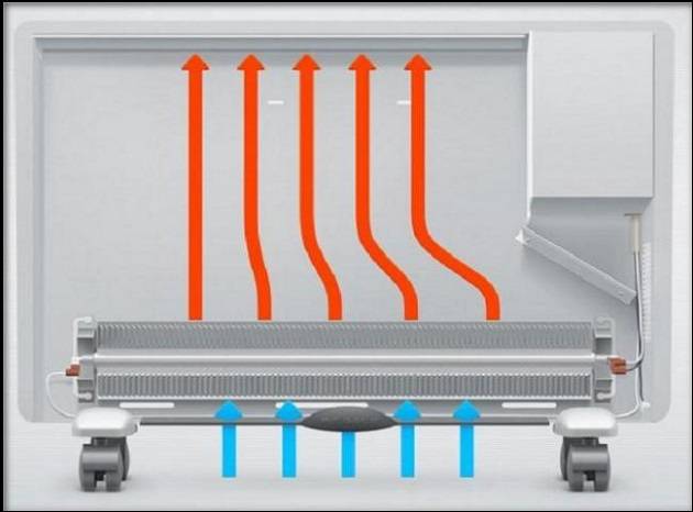 - нагревательный элемент. «Сердце» конвектора предоставлено в виде вольфрамовой спирали, которую сверху прикрывает керамическая трубка. Именно спираль нагревается от электричества, достигая разогрева максимум в 600 градусов Цельсия. В результате воздух в корпусе нагревается, затем выталкивается через вытяжные прорези;