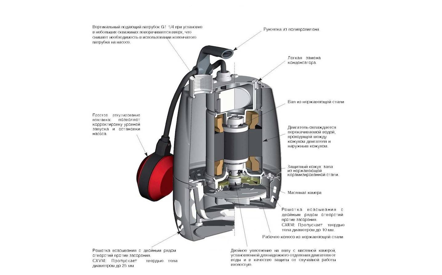 Конструкции состоят из двух ключевых деталей: насоса и электродвигателя. Последний устанавливается внешним модулем и располагается выше уровня перекачиваемых отходов. Насос погружается под воду и выкачивает стоки. Двигатель и насос соединяются при помощи гибкого вала.