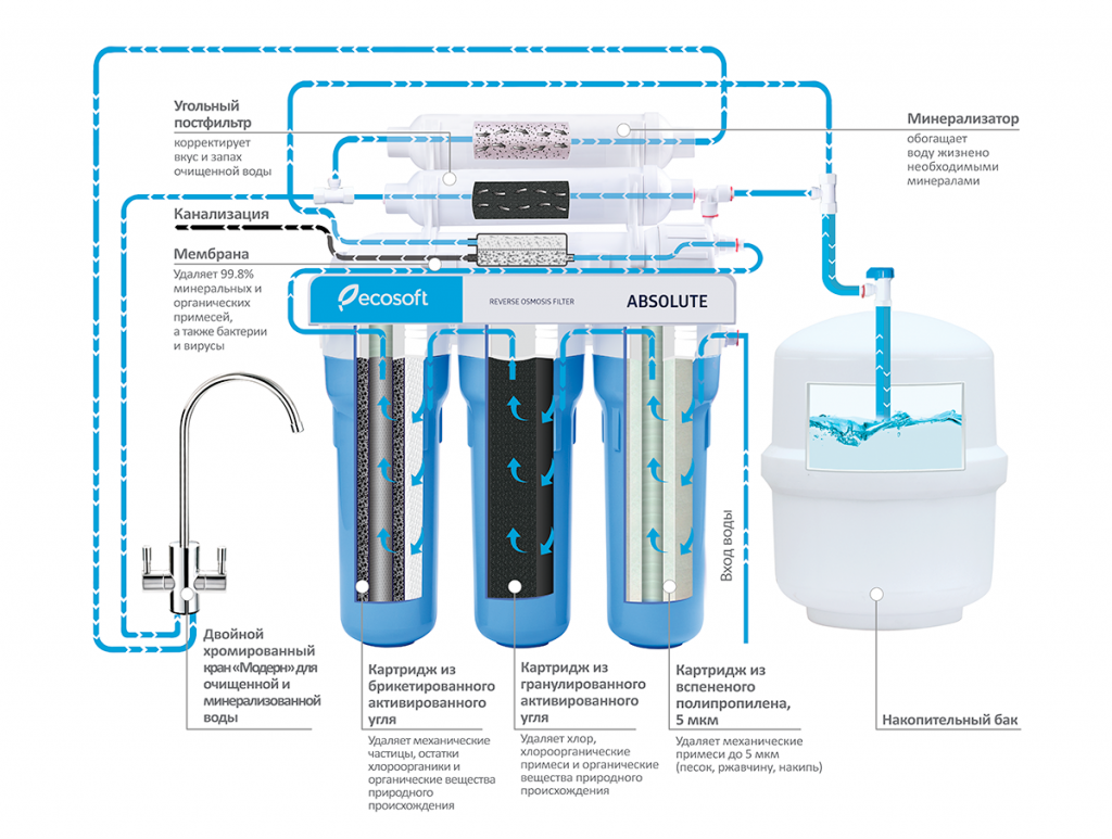 Это самое современное и универсальное решение для подготовки полезной и безопасной питьевой воды для вашей семьи, поскольку фильтры способны очистить практически любую воду.
