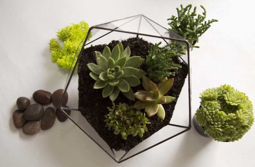 - При сборке необходимо располагать высокие растения вдоль задней стенки, а самые низкие — на переднем плане. Декорирование флорариума полностью зависит от фантазии и вкусовых предпочтений создателя. При необходимости покупают тематические фигурки или собирают природный материал (шишки, желуди, камешки).