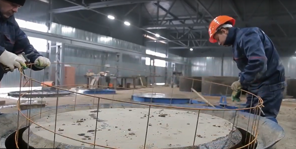 Процесс изготовления в Калуге состоит из двух накладываемые одна на одну форм. Далее следует процесс наложения бетона нужного качества. После укладки материала начинается центрифугирование, во время которого центробежная сила равномерно распределяет бетон. Процесс не завершается после однократного захода, так как изделие при этом может получиться недостаточно качественным. Поэтому на данной стадии скорость периодически изменяют, и заново производят движение в центрифуге. Образуется железобетонное кольцо нужного качества, его отправляют в печь просушить.