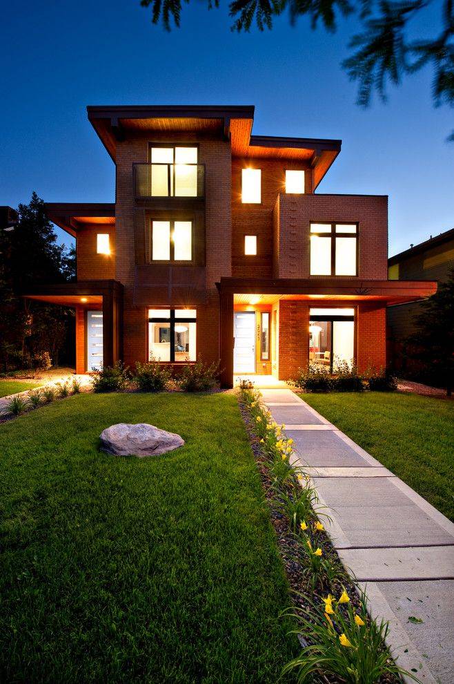 - модерн – достаточно спокойный стиль для оформления фасада кирпичного коттеджа, в котором сочетаются плавность линий со сложными, в архитектурном плане, решениями