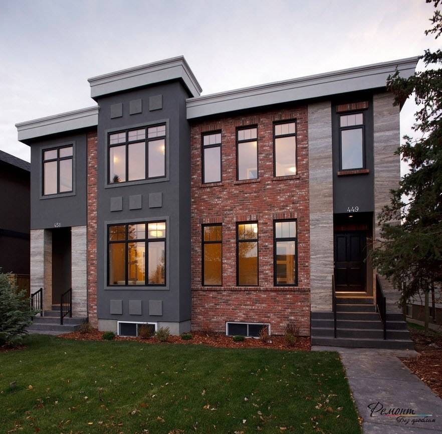 Сочетание модульного дома и кирпичной кладки смотрится очень эффектно