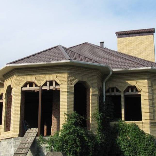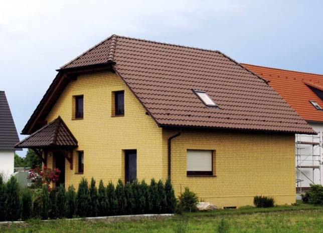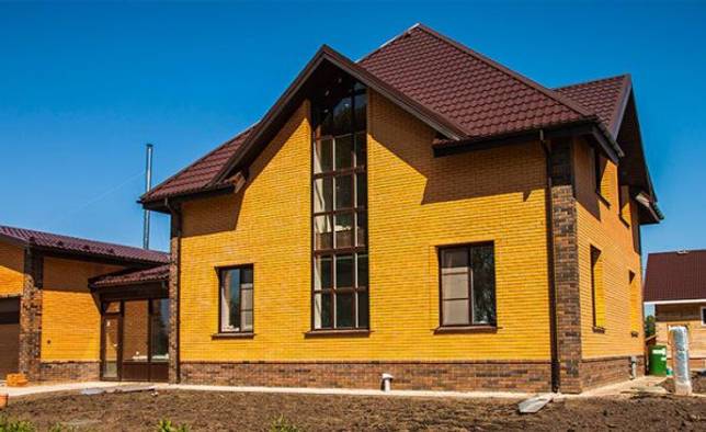 Желтый кирпич будет идеально сочетаться с коричневой кровлей, окнами и дверями.