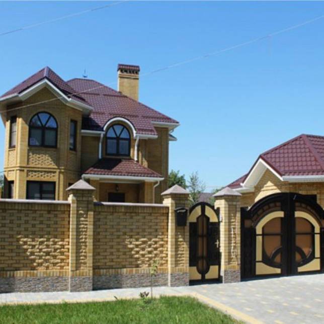 Кирпичные дом и забор, выполненные в одном стиле, смотрятся очень красиво