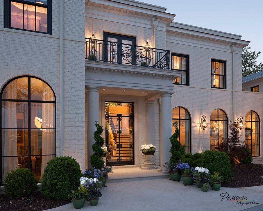 Тем, кто ценит традиции, подойдет оформление фасада дома в классическом стиле. Здесь должны отсутствовать ультрамодные материалы. Основным правилом оформления становится комбинация правильных пропорций во всем.