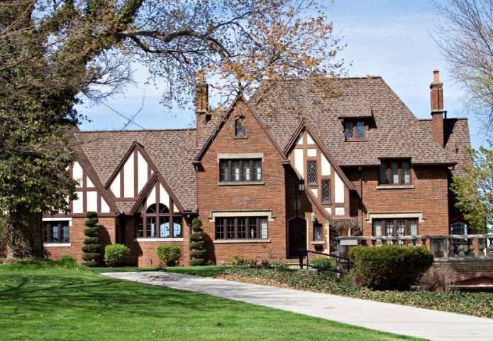 - традиционный английский дом – это смесь георгианского и викторианских стилей, его отличительная и характерная особенность – стены из красного кирпича. Обычно дом в английском стиле имеет два этажа и небольшое чердачное (нежилое) помещение (чулан, комната для сушки белья), реже – дом с мансардой. Фасад – строгий, с минимумом украшений, другие характерные черты – симметричность. Равномерное распределение окон по фасаду, парные трубы