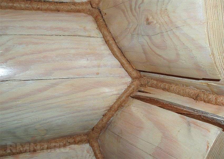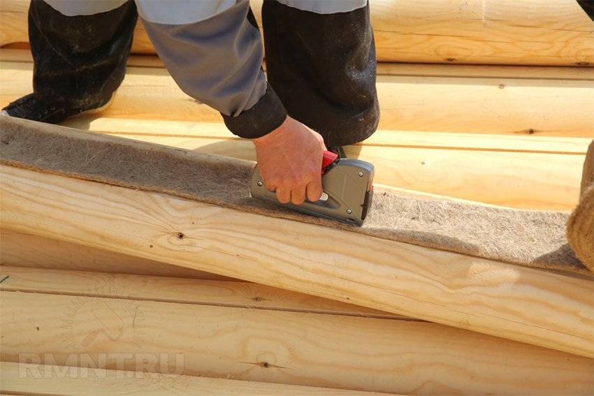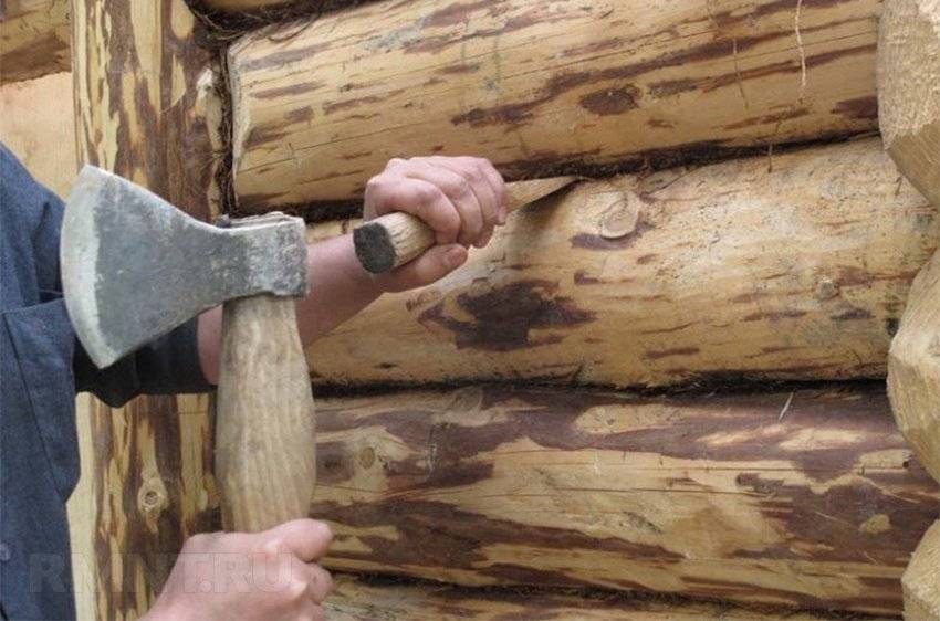 вначале забивается материал по верхней кромке бревна и только после — по нижней; работы по конопатке начинаем со щелей нижнего венца, с обеих его сторон. Затем переходим к нижнему венцу соседней стены и так далее