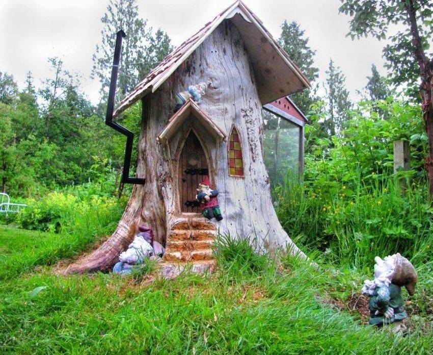 Домик из пня с крышей, окошками и цветниками – балкончиками.