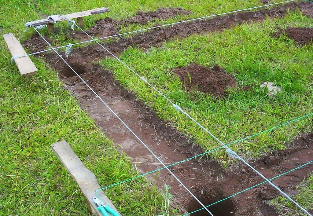 Траншея должна соответствовать ширине будущей ленты, в глубину порядка 40-60 см. По периметру основания производится бурение скважин. Они охватывают всю коробку будущей постройки, также находятся под будущими стенами, как несущими, так и ненесущими