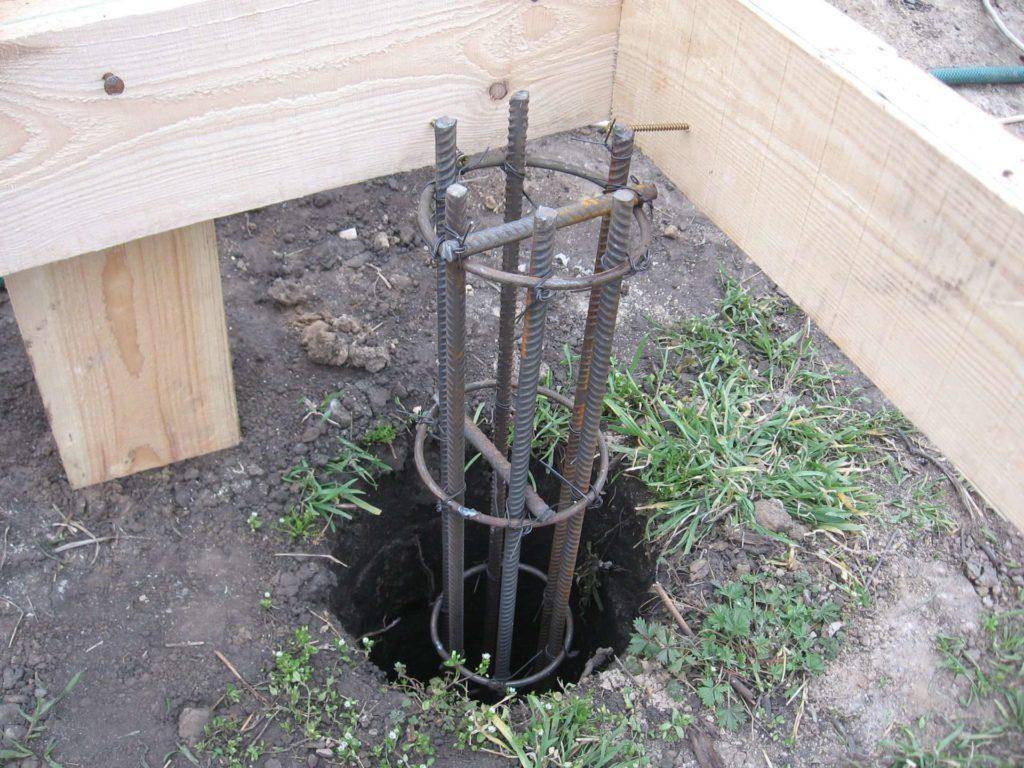 Цилиндрическая конструкция должна быть меньше размеров скважины на 3-5 см. Обвязка стержней проводится вязальной проволокой, пластиковыми хомутами. Армирующий каркас должен возвышаться над землей, примерно на 30 см. Сборка производится на поверхности земли, каркас спускается в скважину, огражденную обсадной трубой.