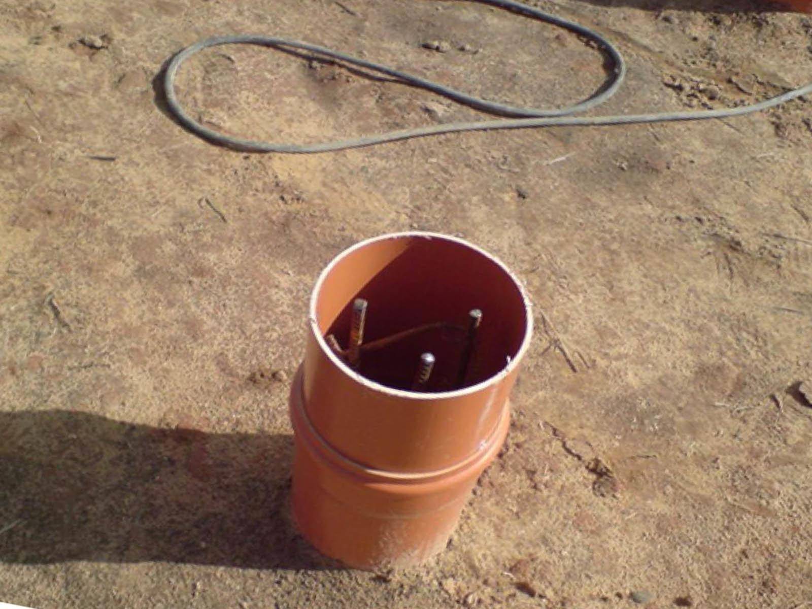 ШАГ 2: труба. Далее нужно вставить трубу на глубину 1,5 метра, и залить в нее бетонный раствор. При этом нужно немного поднимать трубу для того, чтобы предотвратить выталкивание основания с грунта.