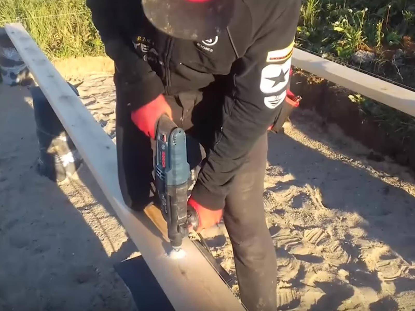 ШАГ 4: ростверк. Высота свай должна быть не менее 40 см от земли. После установки свай, сверху на них фиксируется металлический оголовок, который выполнен из толстой листовой стали. Уже после этого монтируем ростверк или брус поверх всей конструкции.