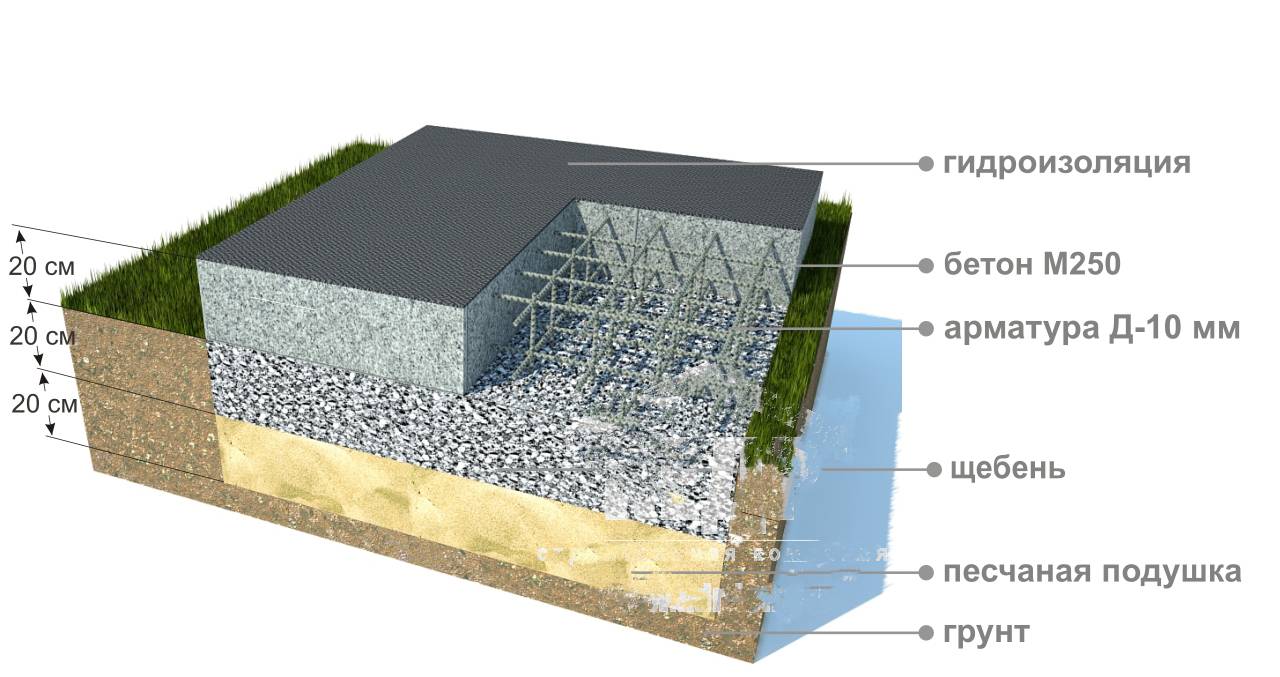 Фундамент укладывают на песчано-гравийную подушку, укрепляют арматурой, покрывают гидроизоляционным слоем