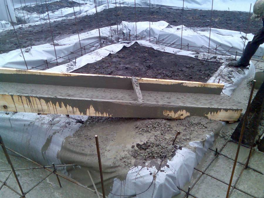 Приступаем к заливке бетона. Для получения действительно монолитной плиты бетон следует заливать достаточно быстро. Использовать лучше уже готовый бетон. В случае заливки бетоном, выполненным самостоятельно, необходимо помнить, что перерыв в поставке бетона не должен превышать одного часа.