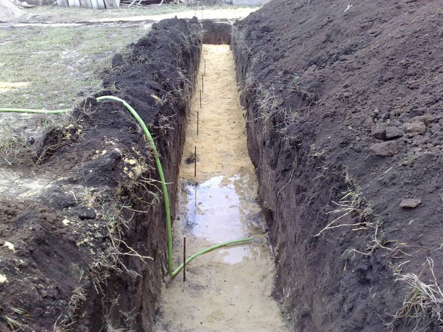Песчаная подушка нужна для выравнивания подошвы и для дренирования траншеи. Используется чистый речной песок без глинистых включений.