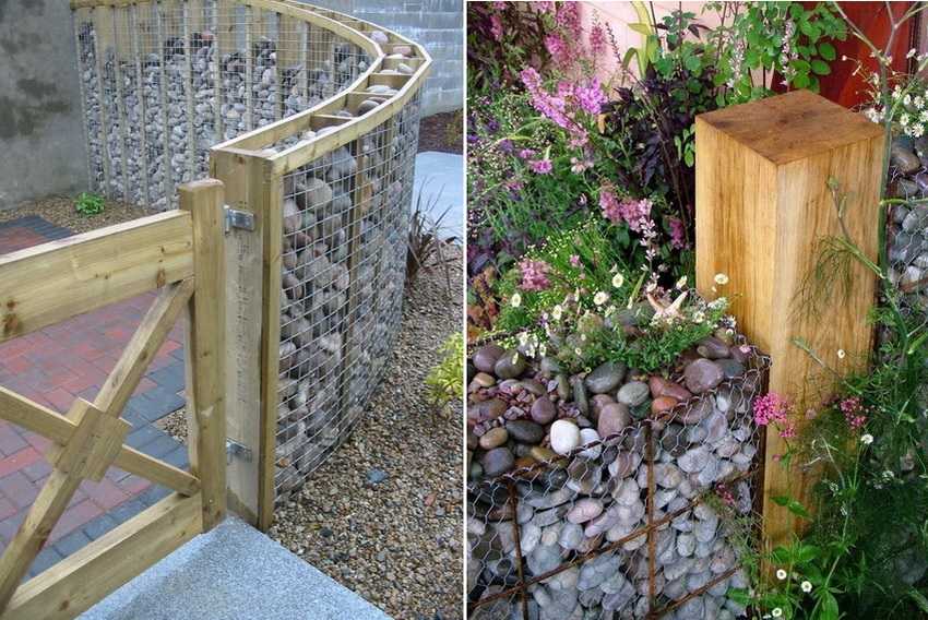 Чаще можно встретить забор из габионов. Они используются в качестве материала для столбов, опоры заграждения. В его пролетах блоки с камнями могут перемежаться с деревом, пластиком, металлом.