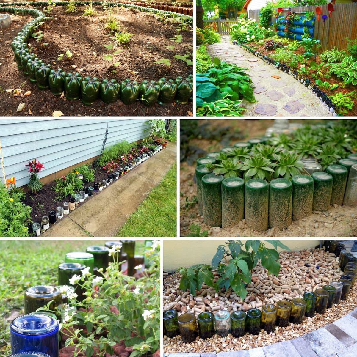 Из стеклянных бутылок. Интересные варианты барьеров вокруг клумб удается получить при использовании бутылок одного объема из зеленого стекла. Такой объект органично смотрится при любом стилевом решении окружающего ландшафта