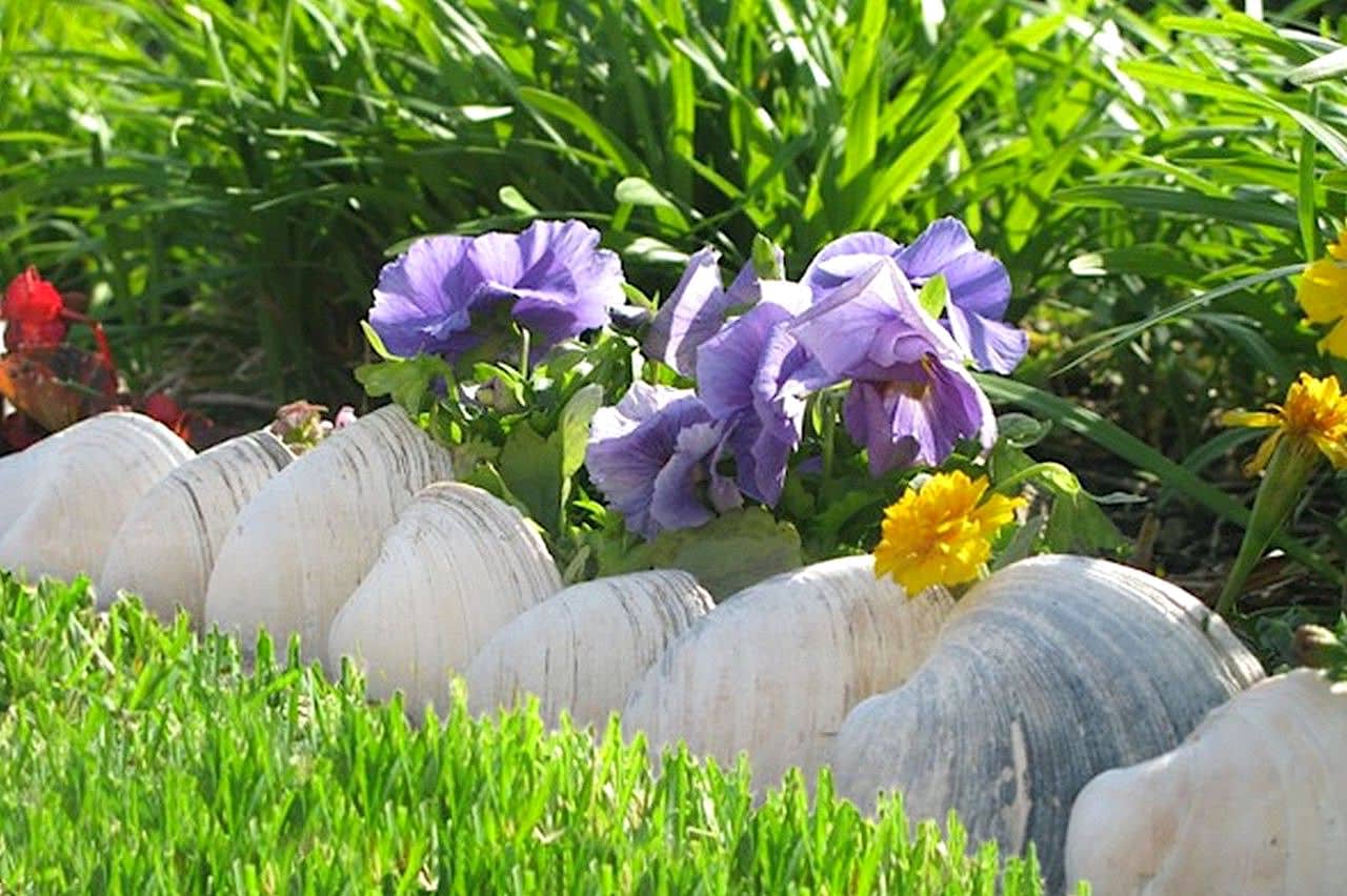 Из ракушек. Своеобразный штрих в ландшафтное оформление привнесут крупные раковины моллюсков. Их устанавливают для обрамления участков с невысокими декоративными растениями.