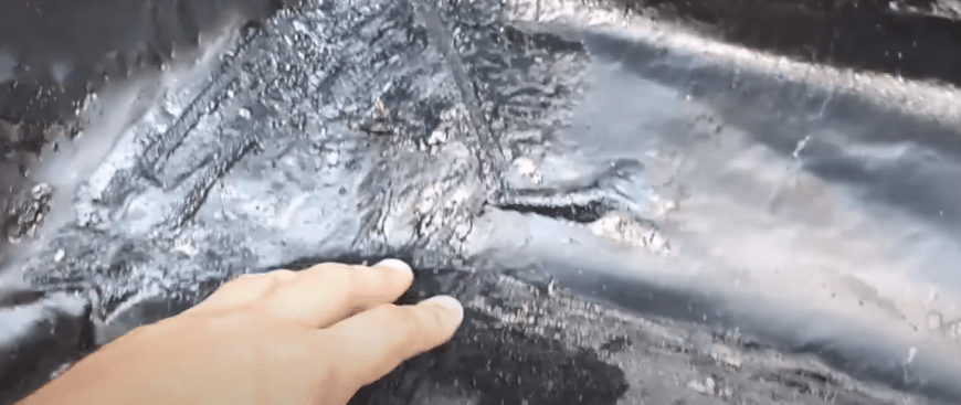 Во время работы пошел дождь. Часть поверхности фундамента с нанесенной мастикой намокла. Битум просто растекся в воде. Я этого не ожидал. То есть он отлип по всему намокшему участку. Исправлял положение я просушкой при помощи строительного фена. Но это тоже не лучший вариант. При такой ошибке следует остановить работу до времени естественного высушивания бетона. Но я решил рискнуть, высушив поверхность. Затем, приклеил кусок рубероида. Высыхал слой очень долго. К счастью, месяц стоял жаркий. Среди других мелких ошибок выделяю: