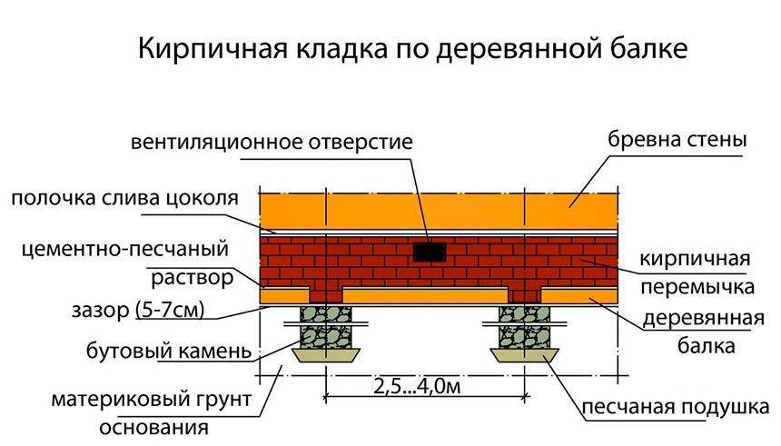 Схема устройства столбчатого фундамента из кирпичной кладки по деревянной балке