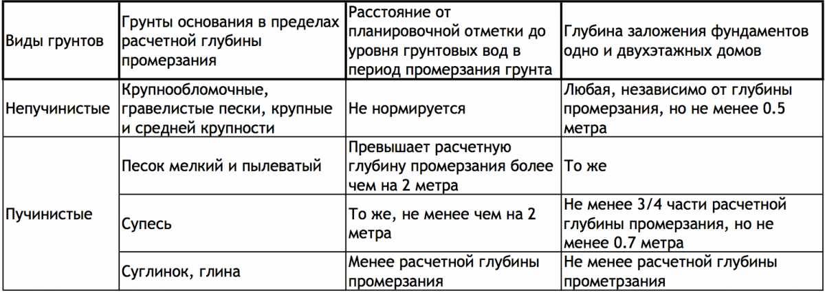 Таблица с рекомендуемой глубиной заложения фундамента в зависимости от типа грунта и уровня подземных вод
