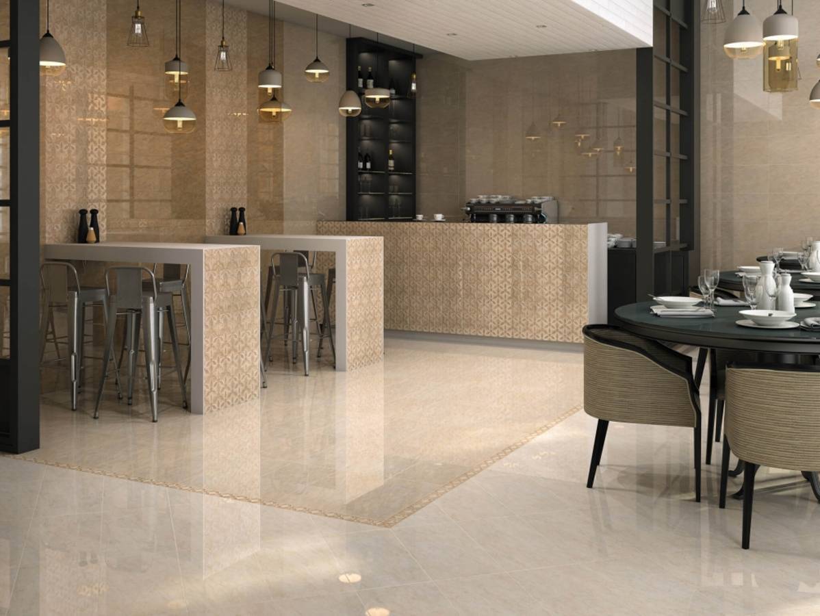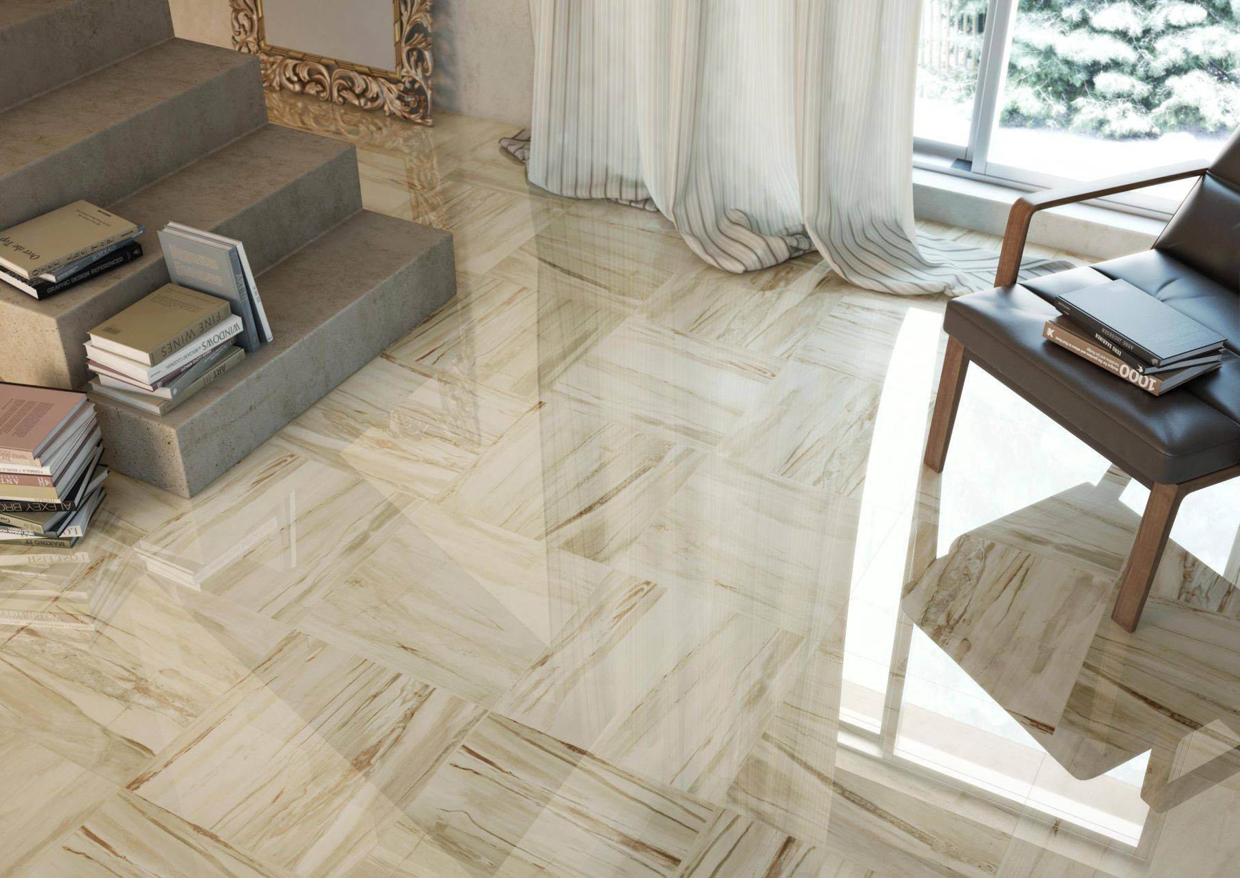 Полированная керамогранитная плитка. Поверхность зеркально – блестящая, цвет насыщенный и глубокий. Используется для отделки стен, фасадов и в качестве напольного покрытия, которое в первую очередь будет дополнять интерьер помещения. Категорически не подходит для влажных мест, так как при попадании жидкости, становится очень скользкой и лучше других видов впитывает влагу. При производстве используют абразивные вещества которые снижают износостойкость поверхности материала. Потому, полированной керамогранитной плитке требуется особый уход. Ее следует покрывать специальной мастикой, для дополнительной защиты поверхности. Если этого не делать, то поверхность с эффектом блеска, со временем будет матовой.