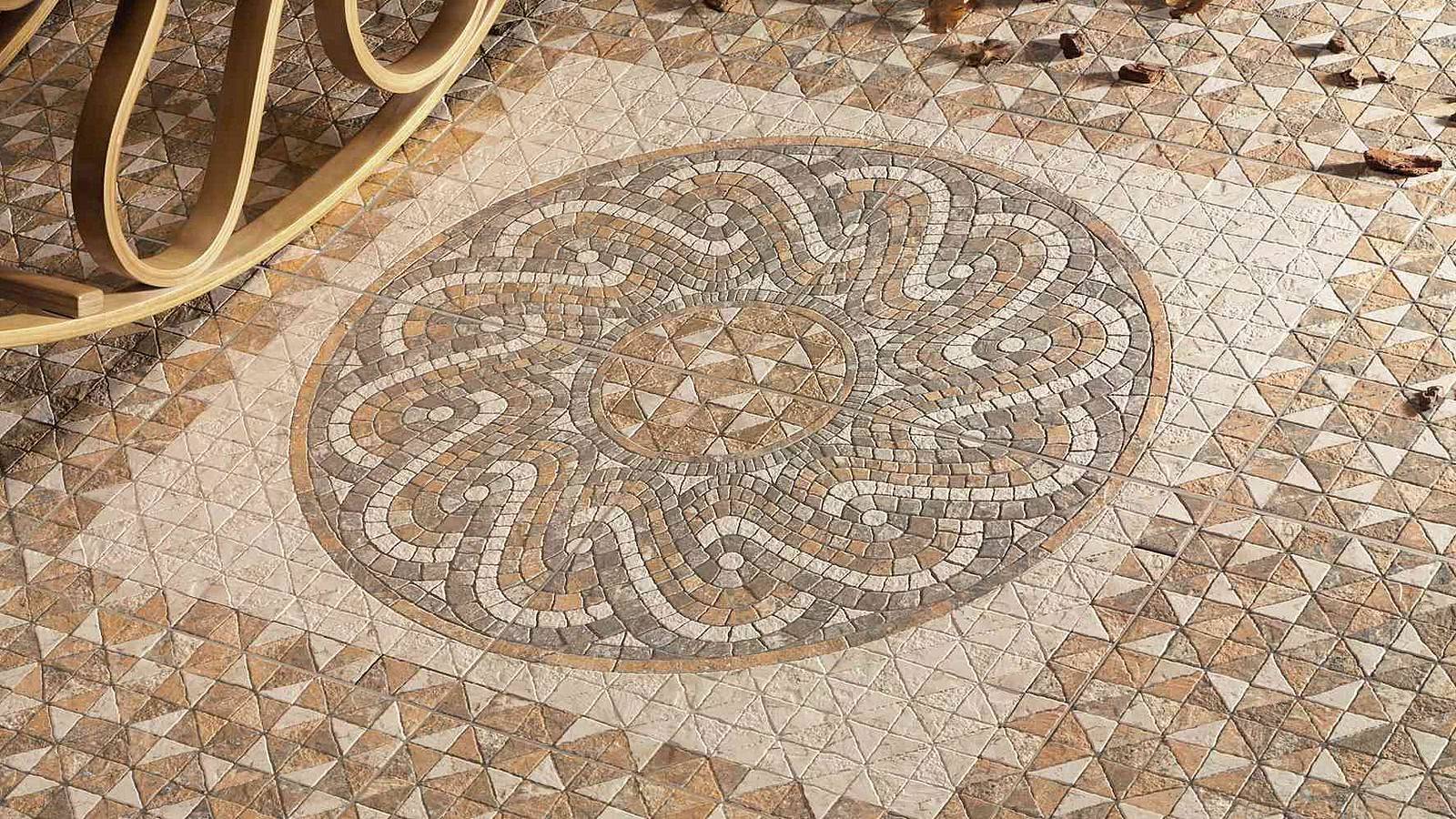 Мозаичная керамогранитная плитка. По эксплуатационным характеристикам подходит для всех видов поверхностей и всех типов помещений. Приобрела популярность благодаря эстетичному внешнему виду. Создает вид мозаичной кладки. Характеризуется повышенной твердостью, сложной кладкой и высокой стоимостью материала, в сравнении с другими видами керамогранита.