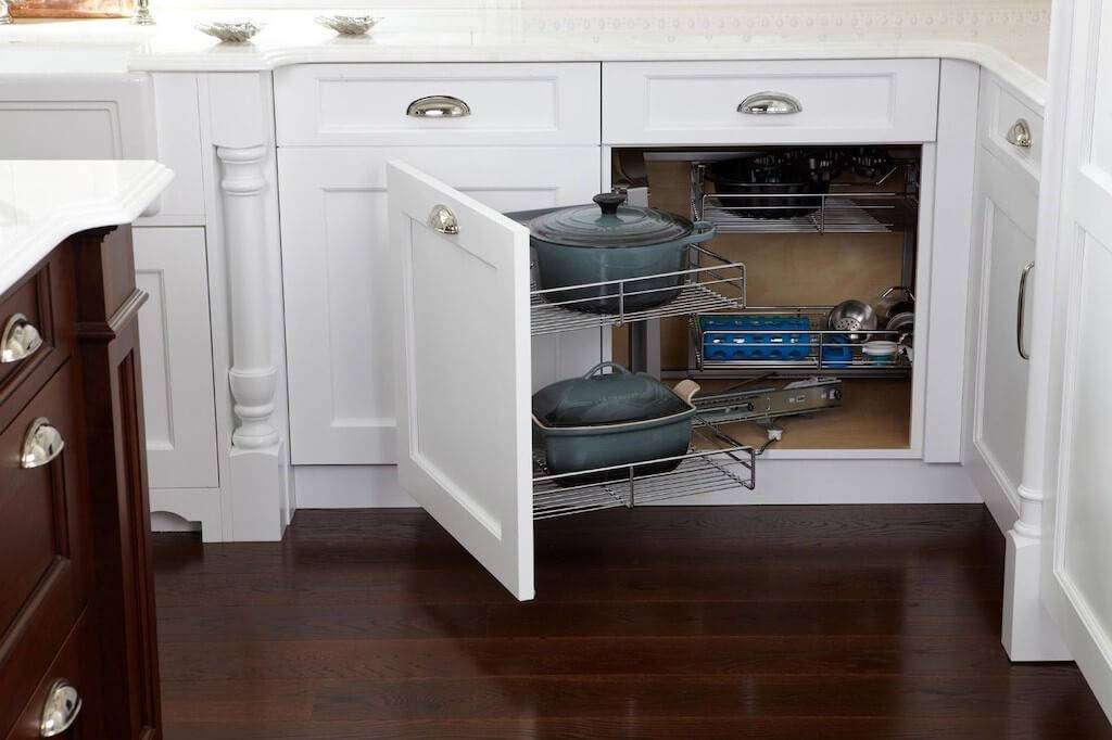 На рынке представлены системы кухонного оборудования, включая угловые шкафы с выдвижными или вращающимися полками. В первом из них полка выдвигается при открытии двери, а на переднем плане находятся предметы, которые хранились в ее глубине.