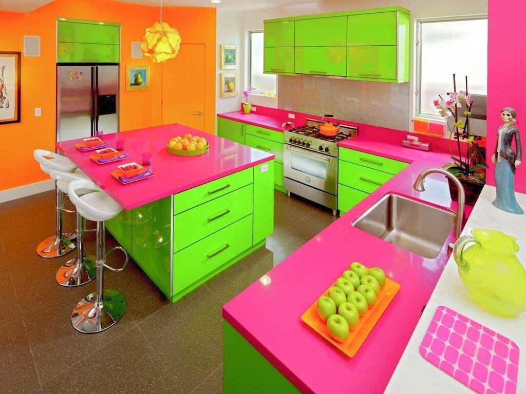 Тона для кухни надо подбирать с особой осторожностью, поскольку в этом помещении проводится много времени, а цвет со временем может надоедать, давить на человека и даже раздражать. Поэтому от смелых решений вроде полностью красной кухни (стены, гарнитур и мебель) стоит отказаться. Яркие акценты надо разбавлять нейтральными тонами
