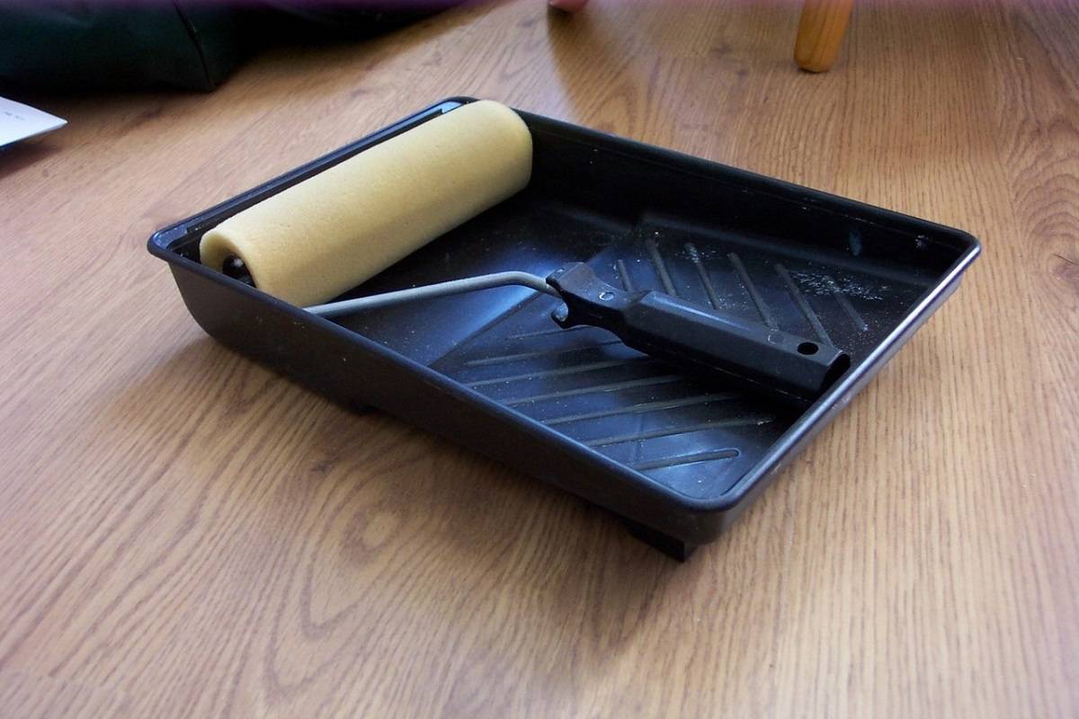 Нанесение грунта. Состав в небольшом количестве наливается в емкость и размешивается. В качестве инструмента используется валик на длинной ручке, в труднодоступных местах – кисть с жесткой щетиной