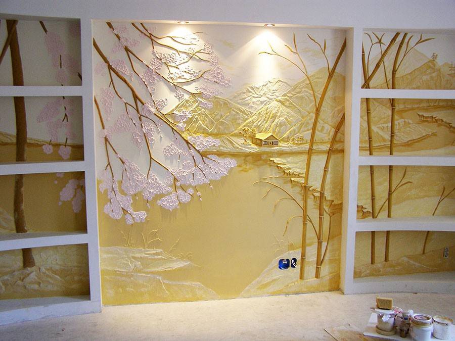 Декоративная штукатурка из обычной шпаклевки должна хорошо высохнуть. После этого обрабатываем ее при необходимости мелкозернистой наждачной бумагой и подчеркиваем рельеф рисунка краской, нанесенной в 2 слоя. Рекомендуем использовать не одну, а две краски для окрашивания, чтобы по максимуму подчеркнуть все изгибы и переходы. В качестве базового слоя наносим краску темного оттенка валиком с длинным ворсом, а когда она полностью высохнет – краску более светлого оттенка, используя уже валик с коротким ворсом.