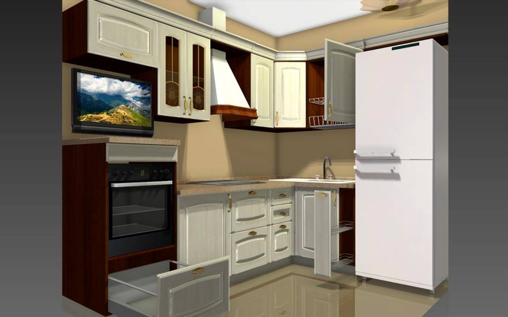 В большинстве случаев для малогабаритных кухонных помещений не подходит создание островного, двухрядного или П-образного расположения мебельного гарнитура. Проектируя интерьер маленькой кухни, предпочитают линейный или Г-образный вариант расстановки кухонной мебели.