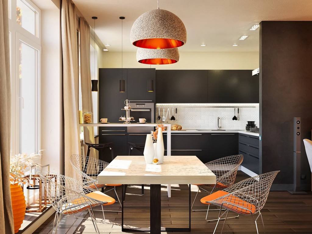 Над столом, где будите принимать пищу, стоит повесить рассеивающие свет плафоны, можно дополнить интерьер бра или торшером у дивана. Над рабочим столом необходима направляющая лампа, точечные светильники на потолке или подсветка снизу навесного шкафа.